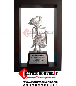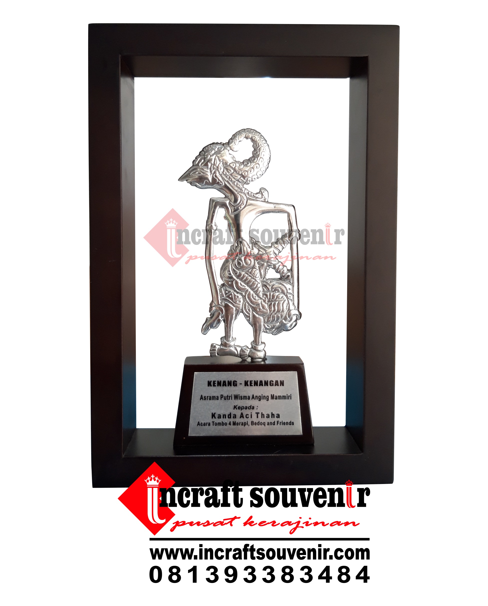 Plakat Wayang merupakan produk plakat yang eksklusif dan elegan. Plakat Wayang dengan kombinasi variasi bahan logam pilihan dan berkualitas menjadikan Plakat Wayang banyak sekali diminati baik instansi pemerintah, BUMN, Universitas dan juga perusahaan – perusahaan swasta. Produk Plakat Wayang ini terkenal dengan nilai kemewahanya dengan kombinasi dan dilengkapi dengan kotak bludru / batik menambah nilai eksklusufitas Plakat Wayang ini. Harga Plakat Wayang sendiri bervariasi tergantung dari kesulitan juga ukuranya.