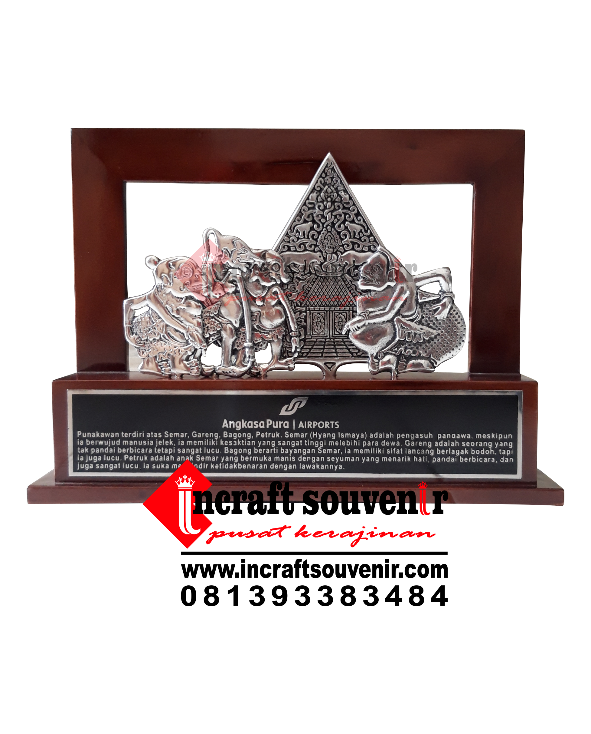 Plakat Wayang merupakan produk plakat yang eksklusif dan elegan. Plakat Wayang dengan kombinasi variasi bahan logam pilihan dan berkualitas menjadikan Plakat Wayang banyak sekali diminati baik instansi pemerintah, BUMN, Universitas dan juga perusahaan – perusahaan swasta. Produk Plakat Wayang ini terkenal dengan nilai kemewahanya dengan kombinasi dan dilengkapi dengan kotak bludru / batik menambah nilai eksklusufitas Plakat Wayang ini. Harga Plakat Wayang sendiri bervariasi tergantung dari kesulitan juga ukuranya.