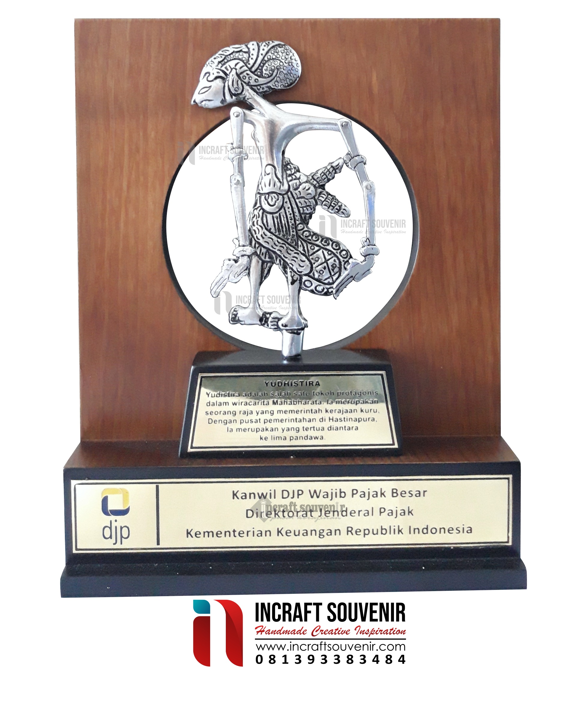 Plakat Wayang merupakan produk plakat yang eksklusif dan elegan. Plakat Wayang dengan kombinasi variasi bahan logam pilihan dan berkualitas menjadikan Plakat Wayang banyak sekali diminati baik instansi pemerintah, BUMN, Universitas dan juga perusahaan – perusahaan swasta. Produk Plakat Wayang ini terkenal dengan nilai kemewahanya dengan kombinasi dan dilengkapi dengan kotak bludru / batik menambah nilai eksklusufitas Plakat Wayang ini.